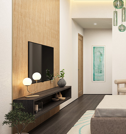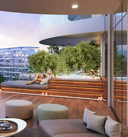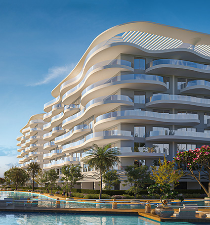 The waterfront apartments boast sleek, curved exteriors by the lagoon. The sweeping balconies effortlessly connect indoor and outdoor spaces, creating a harmonious environment that seamlessly blends modern living amidst the serenity of nature. Every detail is meticulously crafted, radiating simplicity and grace, while the neutral palettes evoke understated luxury and timeless allure.